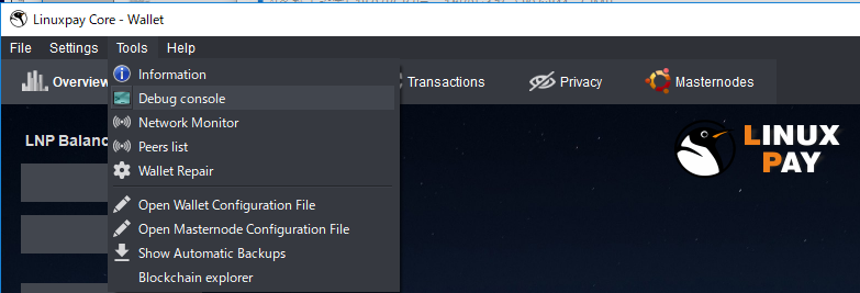 ウォレットのメニューのToolsから「Debug console」を選択します。