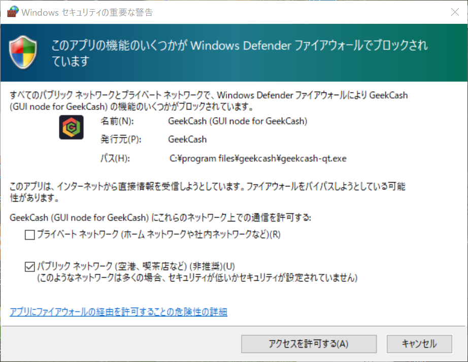 ウォレットを起動すると、初回のみファイアウォールのブロック警告が出力されますが、信頼して「アクセスを許可する」をクリック。