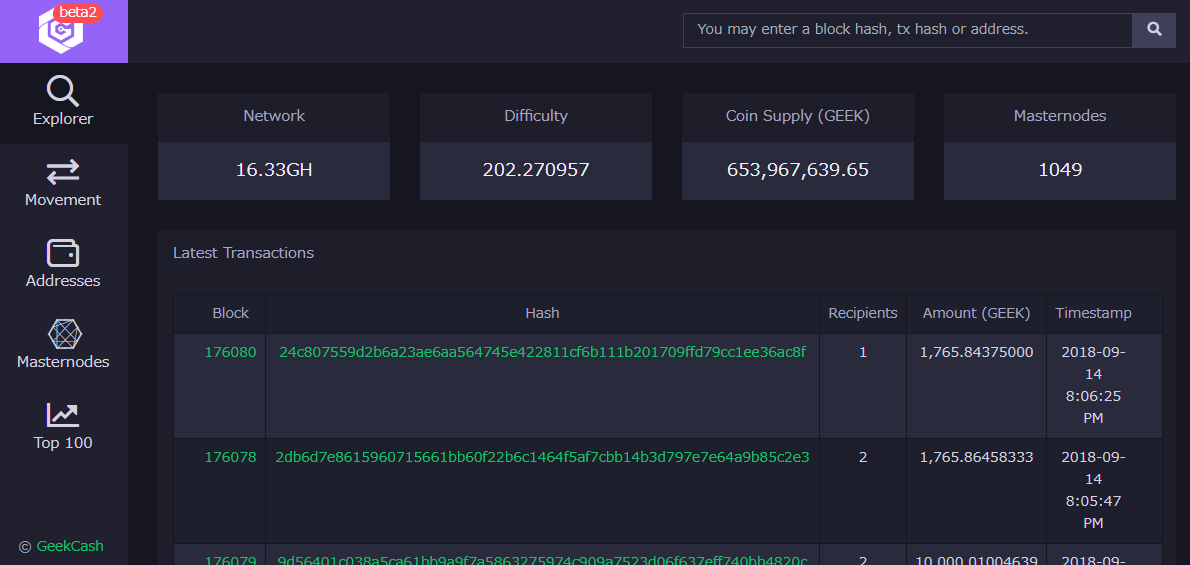 176080ということで、マスターノードの報酬開始180000まで、まもないことがわかります。マスターノード設置のために必要担保は、GeekCash10000枚ですから、トータルの発行枚数6億万枚のうちの、1千万枚のみが担保として固定されている状態です。
