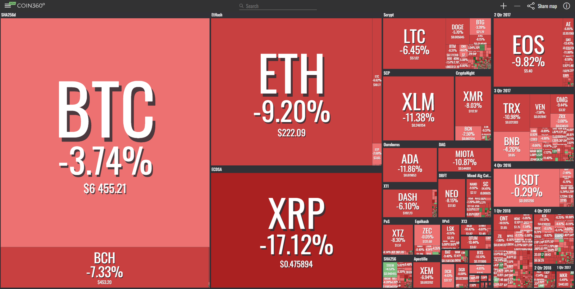 24時間の変動率(図の%表示)や時価総額(枠の大きさ)で、一目で最新の勢力図が見て取れる