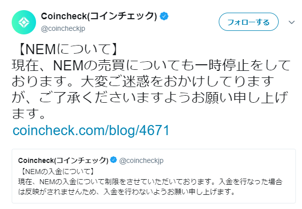 コインチェックのツィートです。