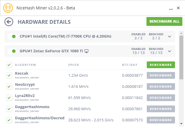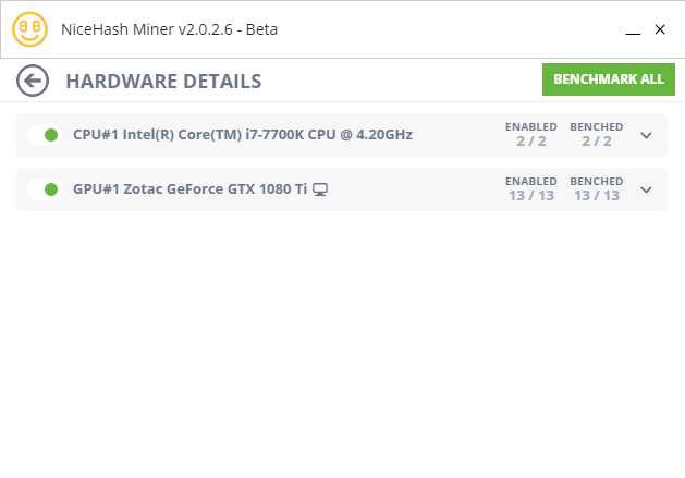 CPU、GPUと複数の機器毎にマイニング対象にするかしないかの制御、また、対象となるアルゴリズムの有無。ベンチマークの実行結果などが、設定されています。