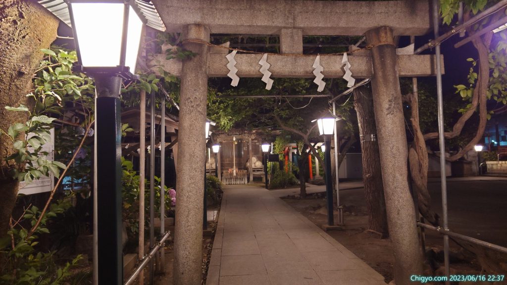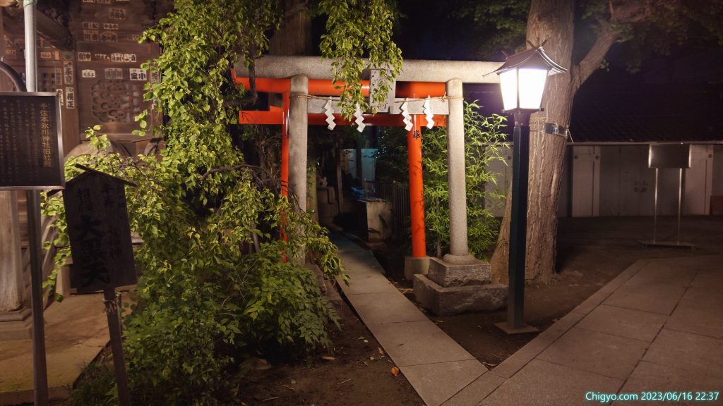 夜の神社なんていうものには、行くのは初詣くらいなものですが、北千住駅をポケモンGOの都合で歩いていた時に、ライトアップされて輝いてる場所に遭遇したのです。こんなにも明るい、神社。無視してもよかったのですが、足が吸い込まれました。