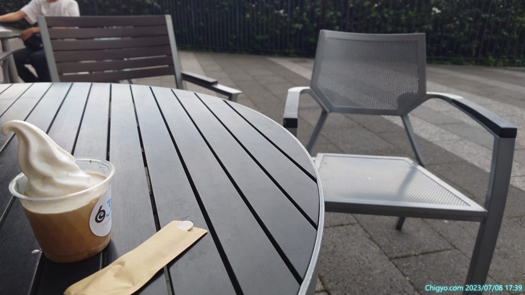 あれれ、これ写真と違うじゃん!!という感じですね。外テラスに出て、すぐに写真を撮影したはずですが、アイスにかけられているはずの、コーヒーがすっかり溶けてしまってました。ここは指定された外テラスですが、残念ですね。