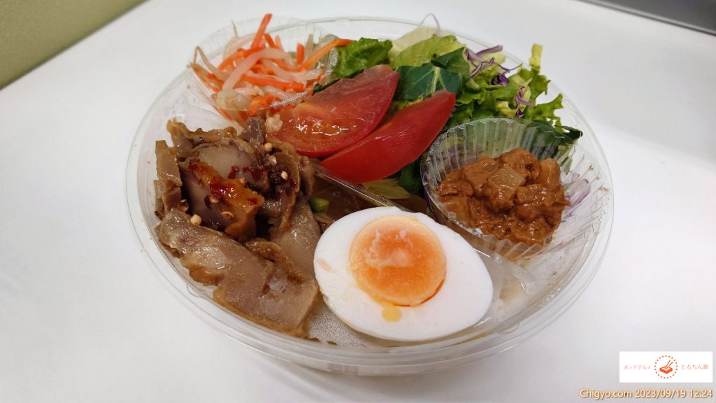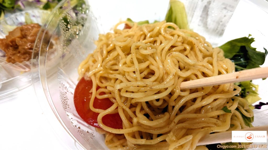 サラダだけ、という選択肢も迷いましたが、少しは炭水化物をということで、麺を選択しました。しっかりと、50円引きシールが貼られています。