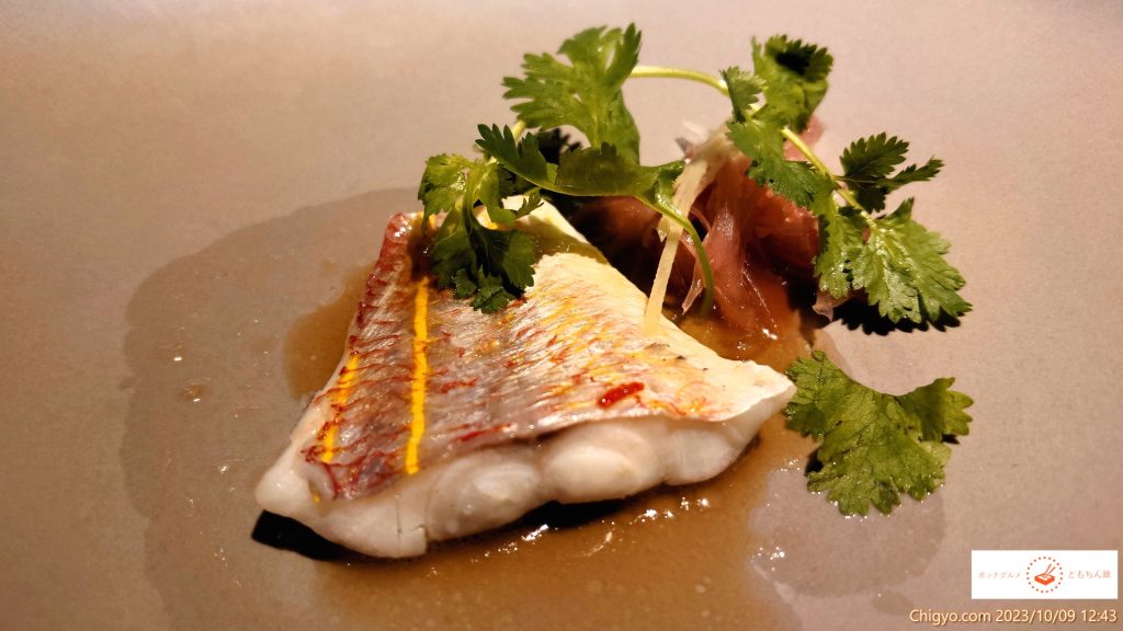 予約時にはメバルの文字もあったのですが、本日はイトヨリの香味蒸しとなっていました。ナンプラー的な甘酢で、さっぱり白身の魚をいただけます。