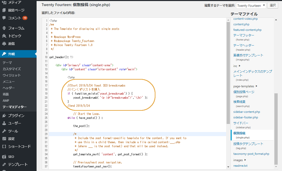 ダッシュボード>外観>テーマエディターからコードを実装していきます。
