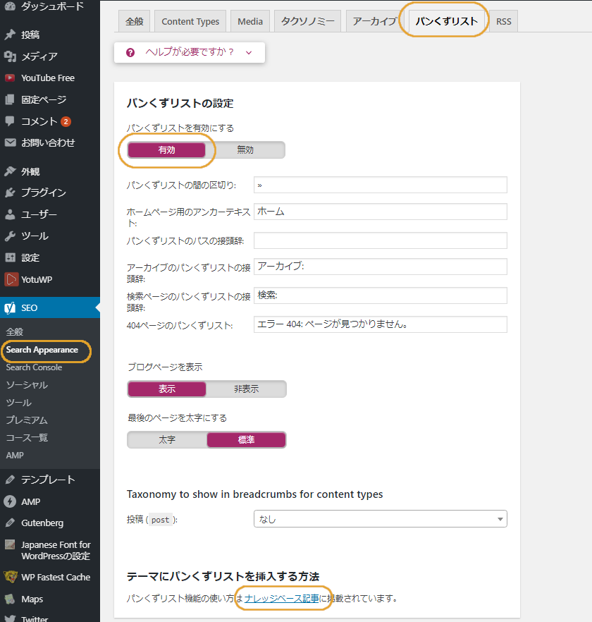 Yoast SEOのSearch Appearanceを選択、パンくずリストタブの、パンくずリストを有効にするを有効にする。